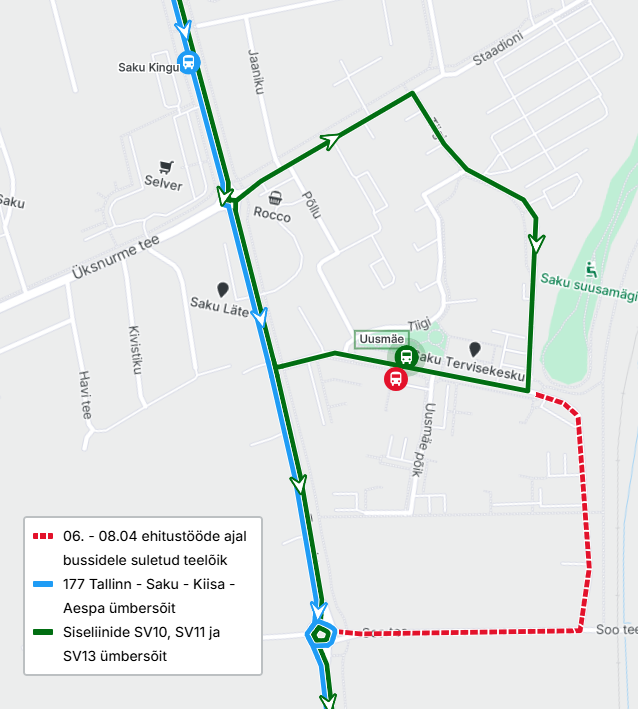 6.–8. aprillil on Uusmäe tänav Saku alevikus osaliselt suletud asfalteerimistöödeks. Busside siseliinid SV10, SV11 ja SV13 sõidavad Uusmäe peatusesse Tiigi tänava kaudu, mis on ajutiselt muudetud ühesuunaliseks. Bussid peatuvad Saku Tervisekeskuse pool asuvas Uusmäe peatuses. Liin nr 177 Tallinn – Saku – Kiisa – Aespa ei teeninda ehitustööde ajal Uusmäe peatust, lähim peatus on Saku Kingu. Asfalteerimistööde tegemise ajal võib olla piiratud Uusmäe tänav 8, 10 ja 12 majadeni ligipääs.