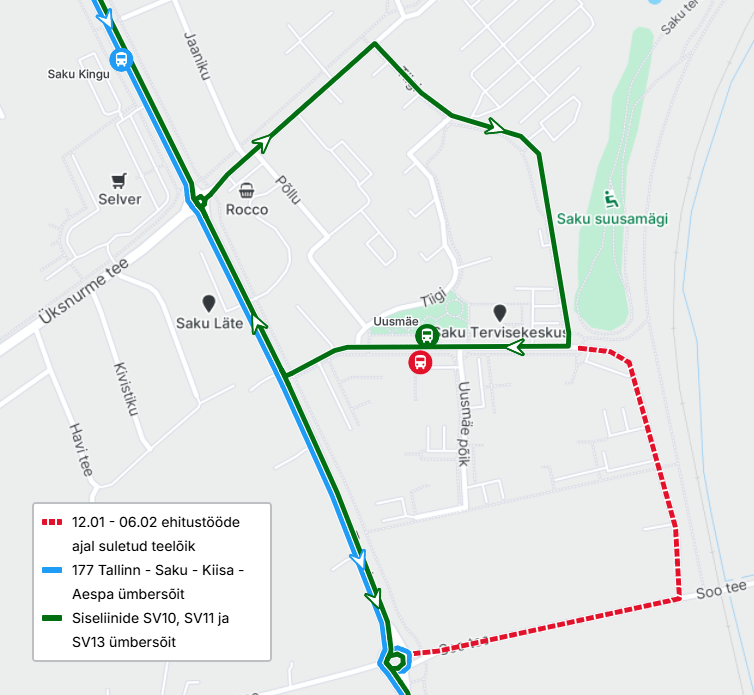 Liinide SV10, SV11 ja SV13 marsruut on ümber suunatud Tiigi tänava kaudu, mis on ajutiselt muudetud ühesuunaliseks. Bussid peatuvad nii Sakust väljuval kui ka siseneval suunal Saku Tervisekeskuse pool asuvas Uusmäe peatuses (peatuse kood 23850-1).