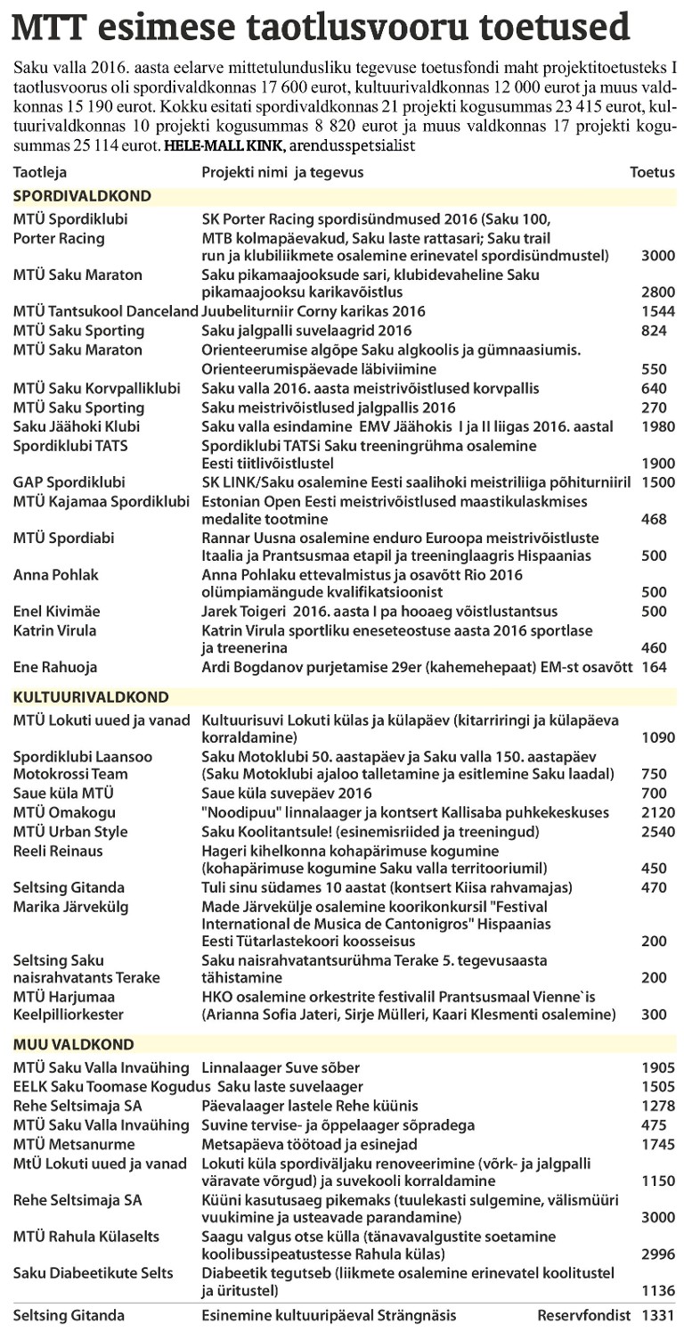 2016. aasta I poole mittetulundusliku tegevuse toetused