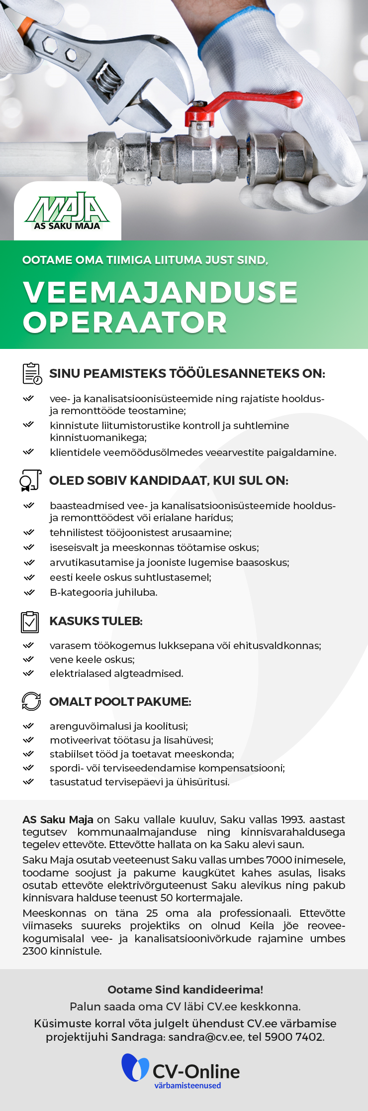 Otsime oma tiimiga liituma veemajanduse operaatorit, kelle peamisteks tööülesanneteks on vee- ja kanalisatsioonisüsteemide hooldus ja remont.